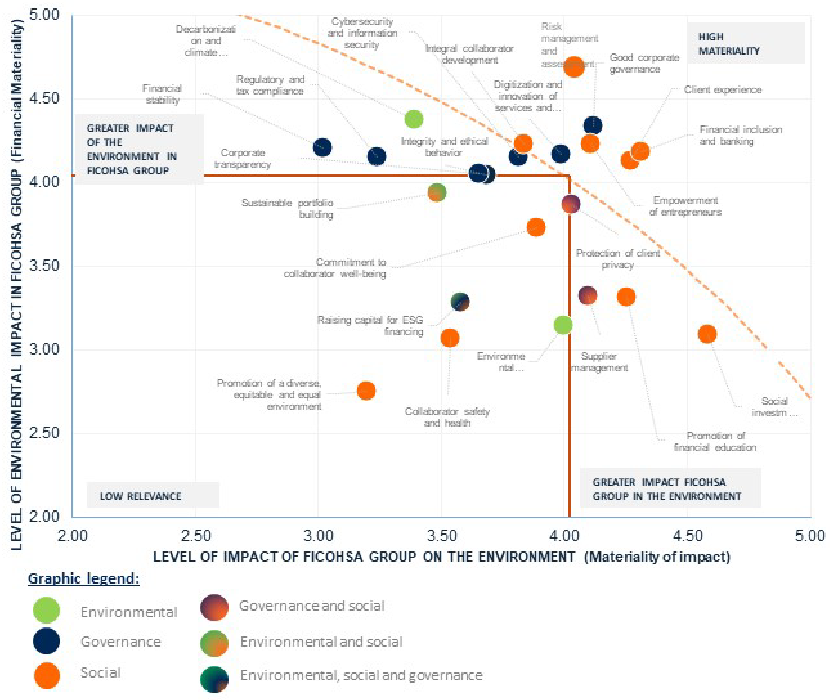 En el 2024 Grupo Ficohsa inicio la actualización de este análisis, utilizando la metodología de doble materialidad bajo el marco de aplicación de la European Financial Reporting Advisory Group (EFRAG), este proceso permitió identificar y priorizar los temas más relevantes para Ficohsa en materia de sostenibilidad, además de conocer como estos temas impactan a sus grupos de interés y, por lo tanto, al desempeño del negocio.